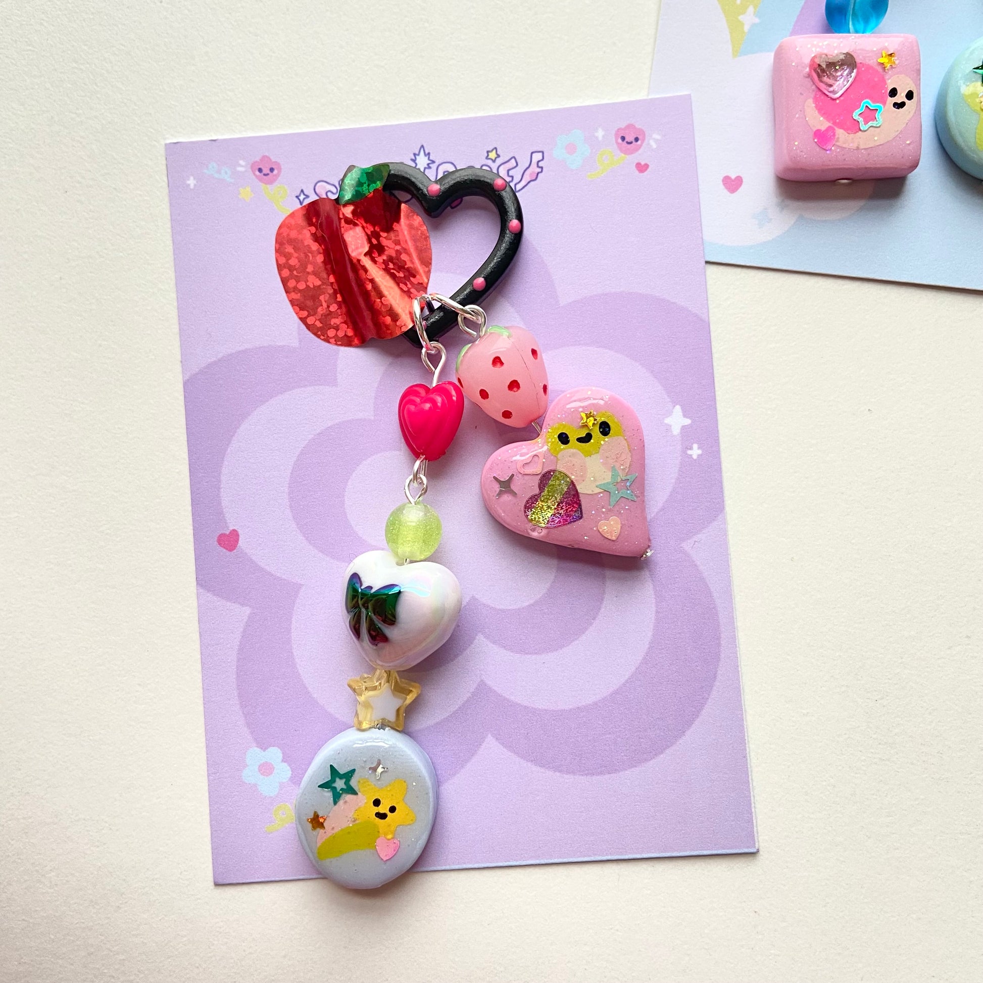 Double charm carabiner/keychain. Mixmatched design with a mix of clay, glass and acrylic beads. One sided charms.