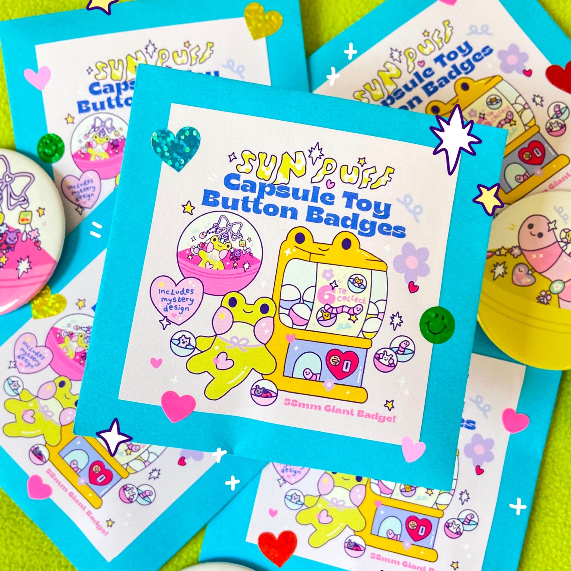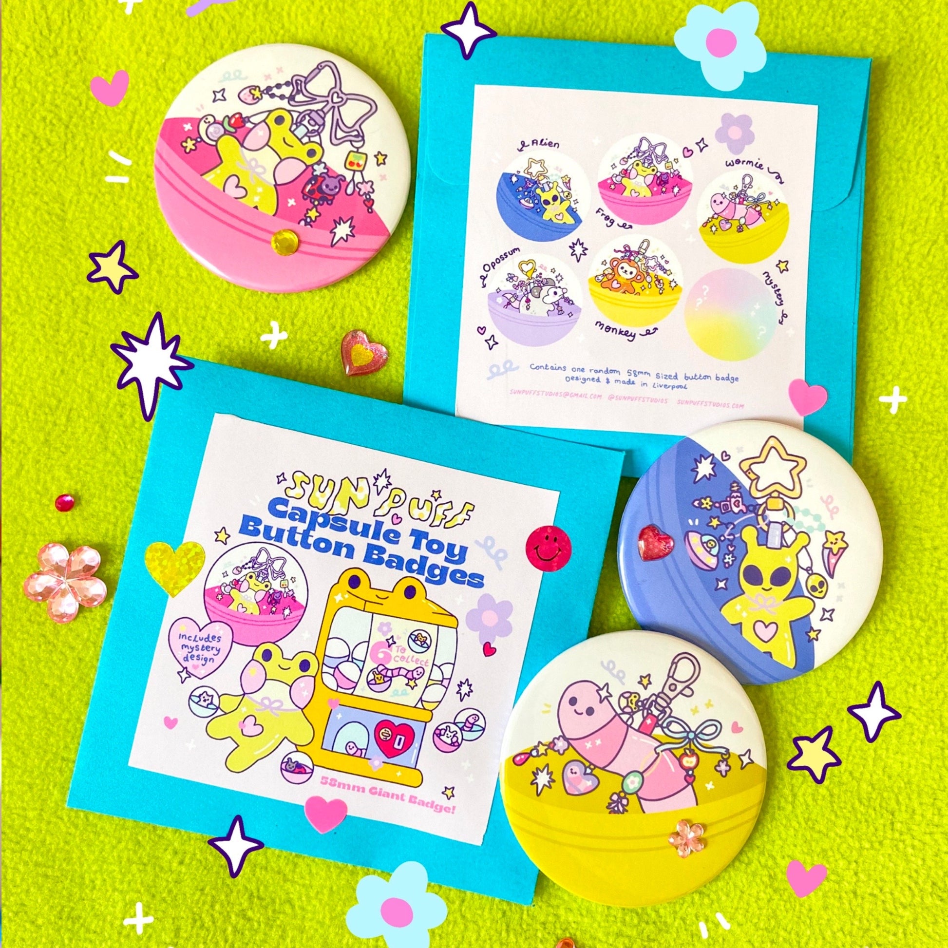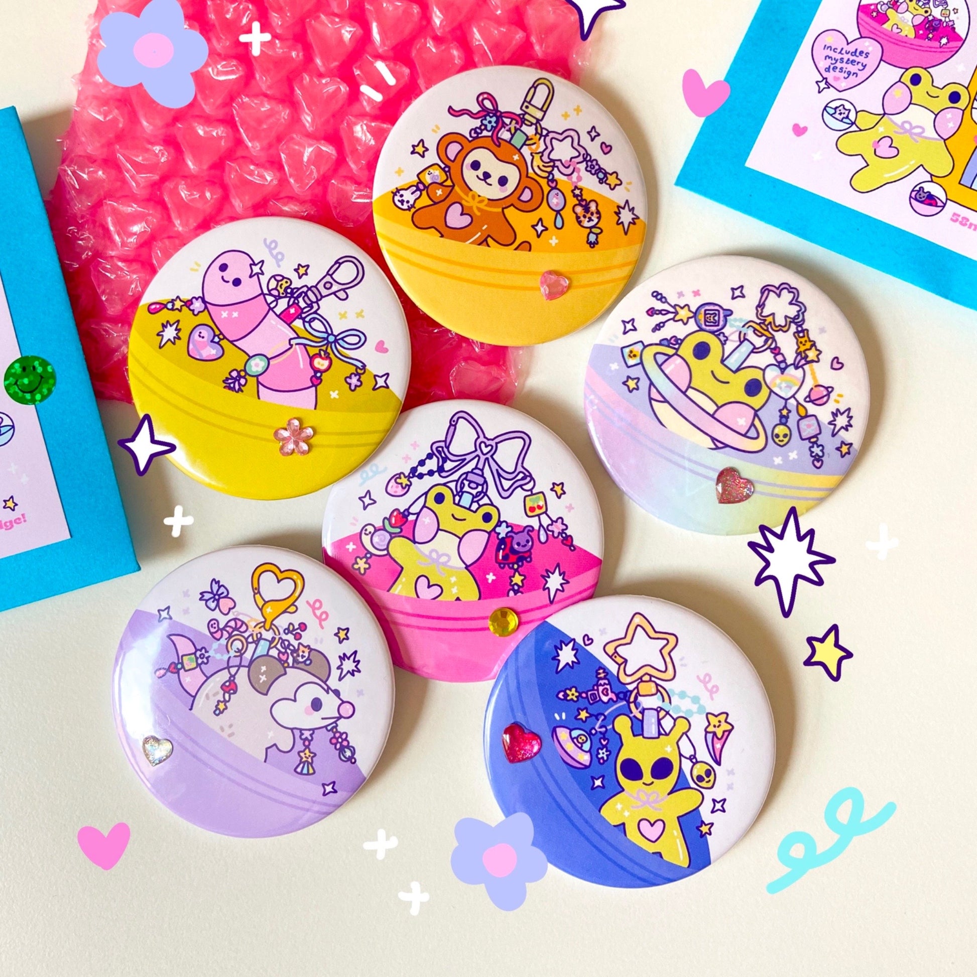 Capsule toy inspired button badge blind bags! Extra large badges, 58mm! Perfect for bags, metal fixtures to make them extra strong. 6 designs to collect including a mystery