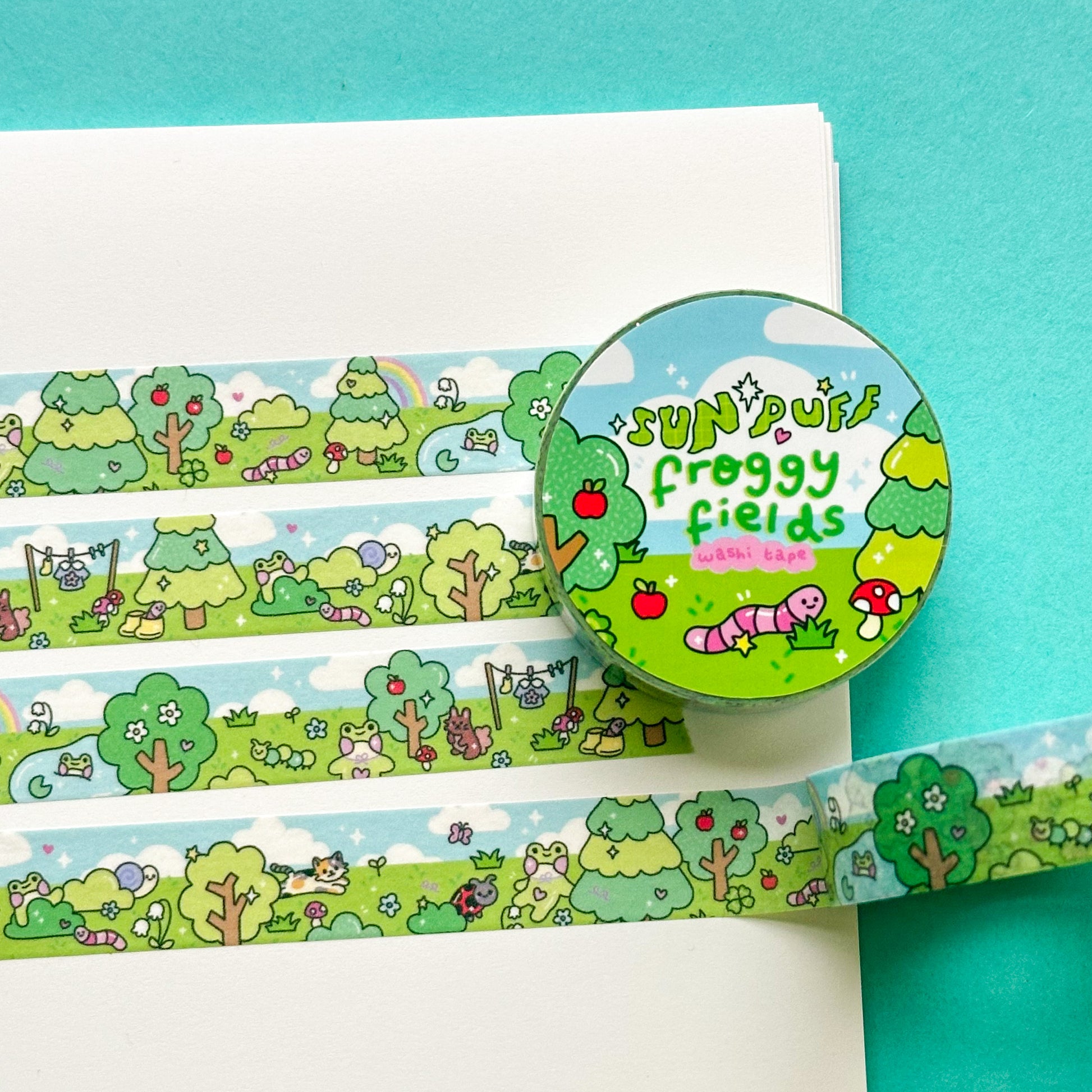 15mm washi tape! Featuring little froggy field doodles. Perfect for journaling, putting prints up & sealing envelopes. Comes with stickered packaging