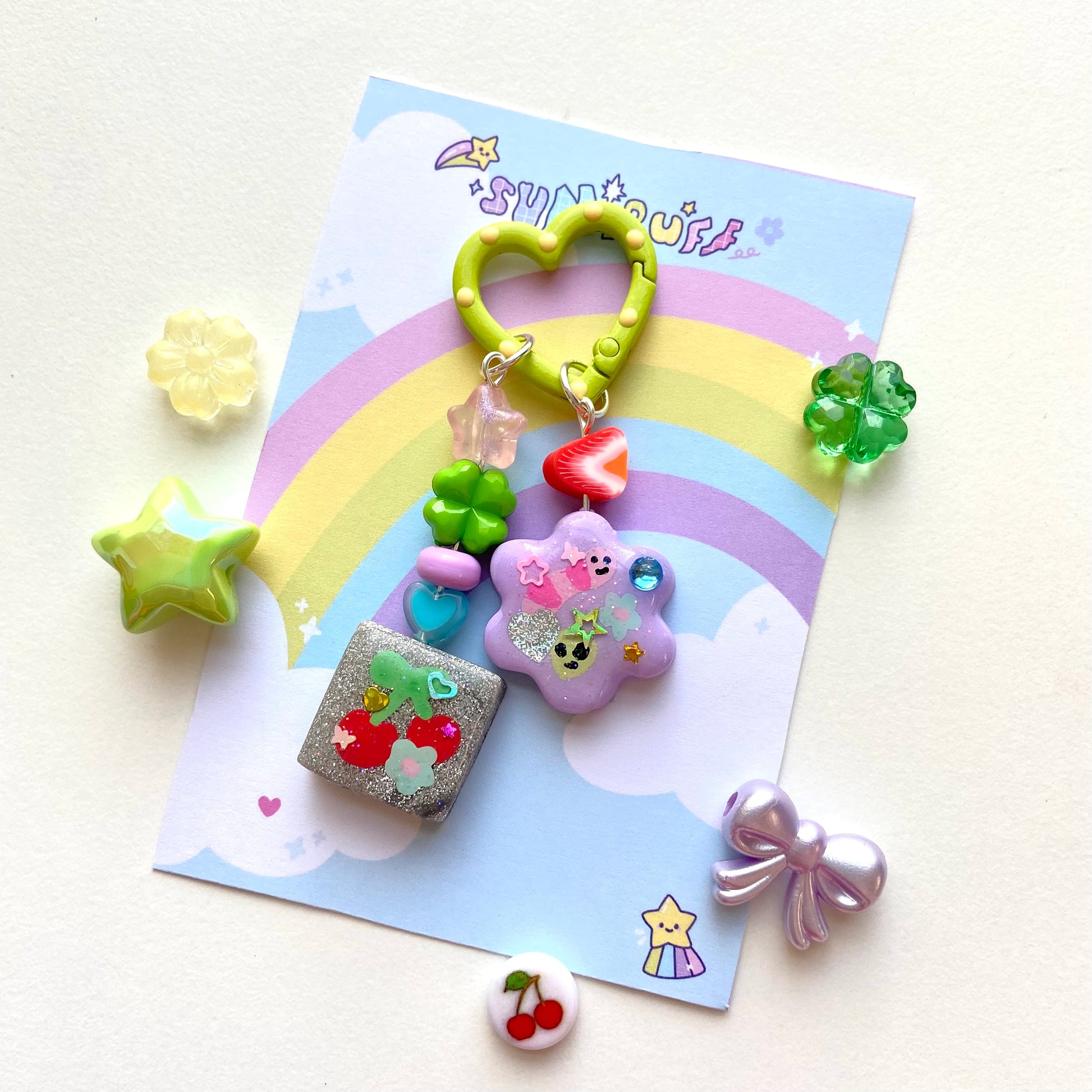 Double charm carabiner/keychain. Mixmatched design with a mix of clay, glass and acrylic beads. One sided charms.