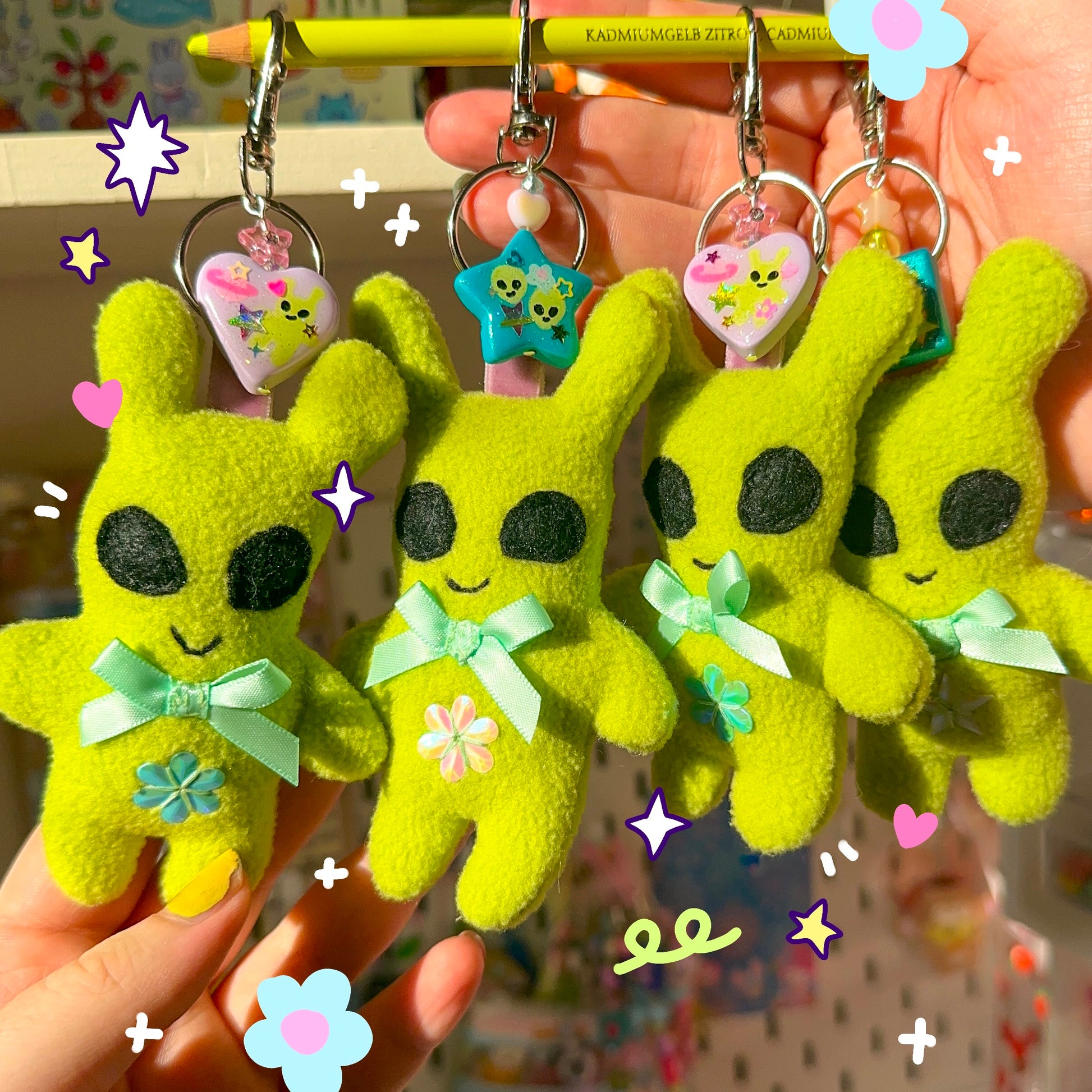 Mini Alien keychain, comes with handmade clay beads and sew in sequins.