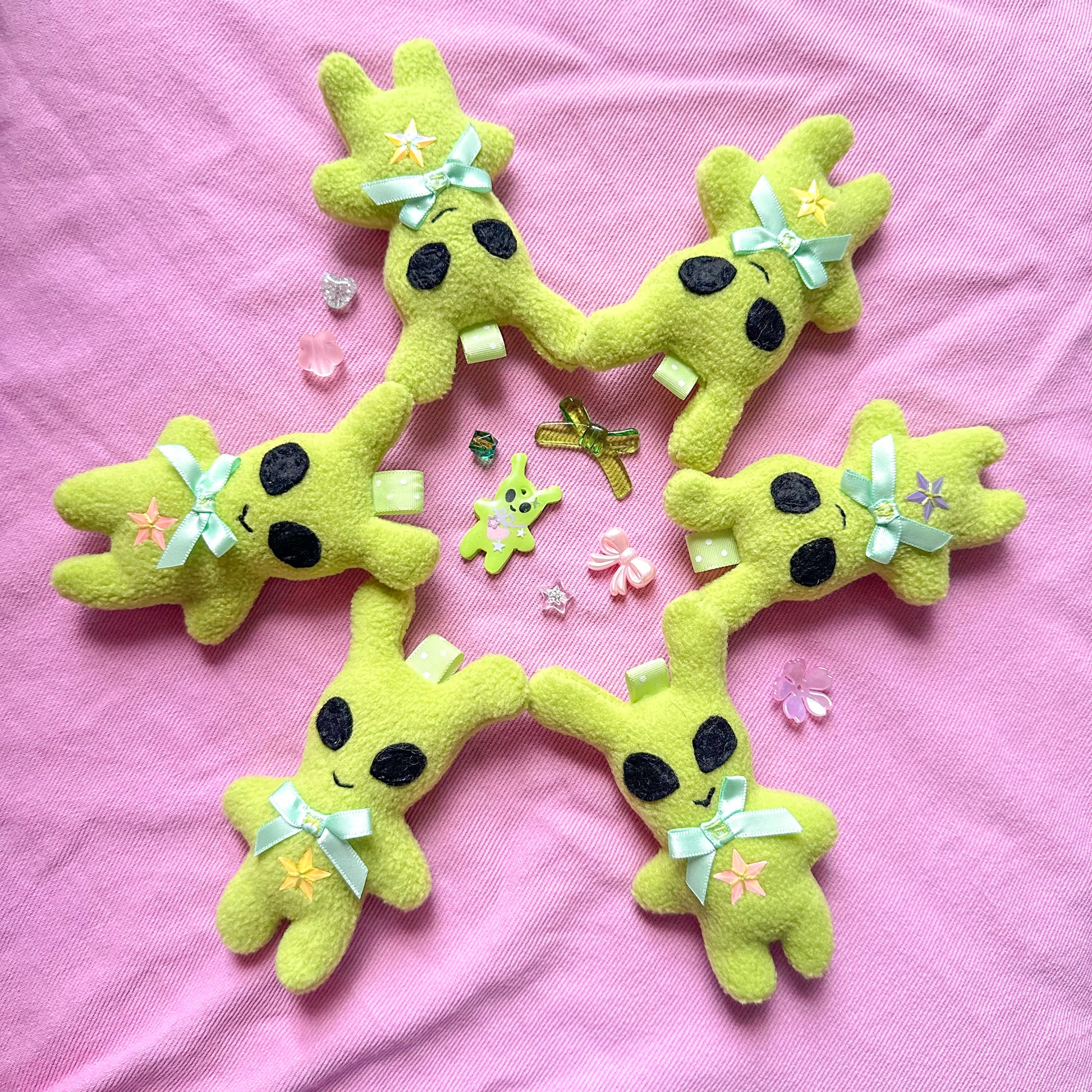 Sun Puffs first plushie range is here! Completely handmade by me down to patterning and beading. Each one is filled with little beans and stuffing, super soft made with fleece. Includes hand sewn details.