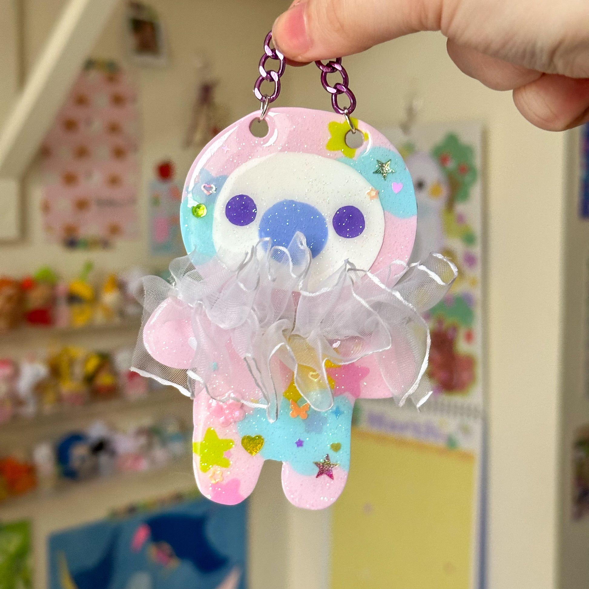 Part of the Sun Puff x Lyric Stitches collab. Cute clown wall hanging made from polymer clay, comes with ruffle attached and metallic chain for hanging.