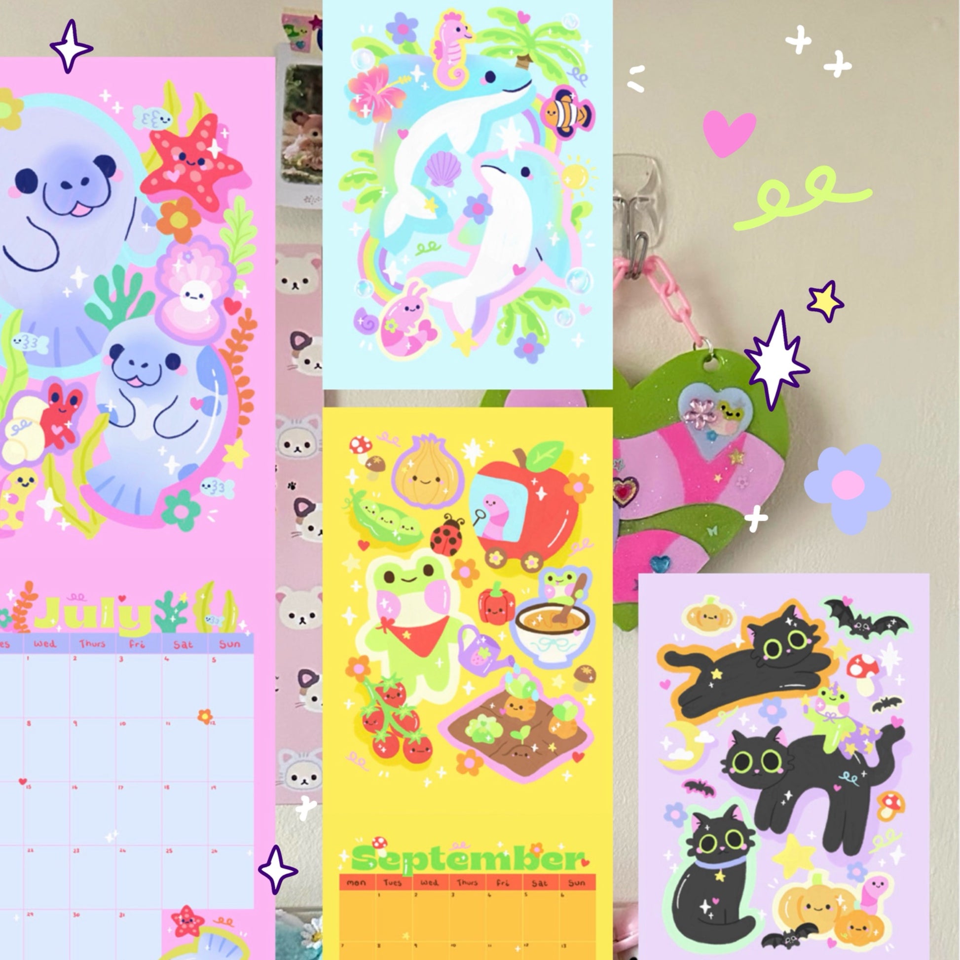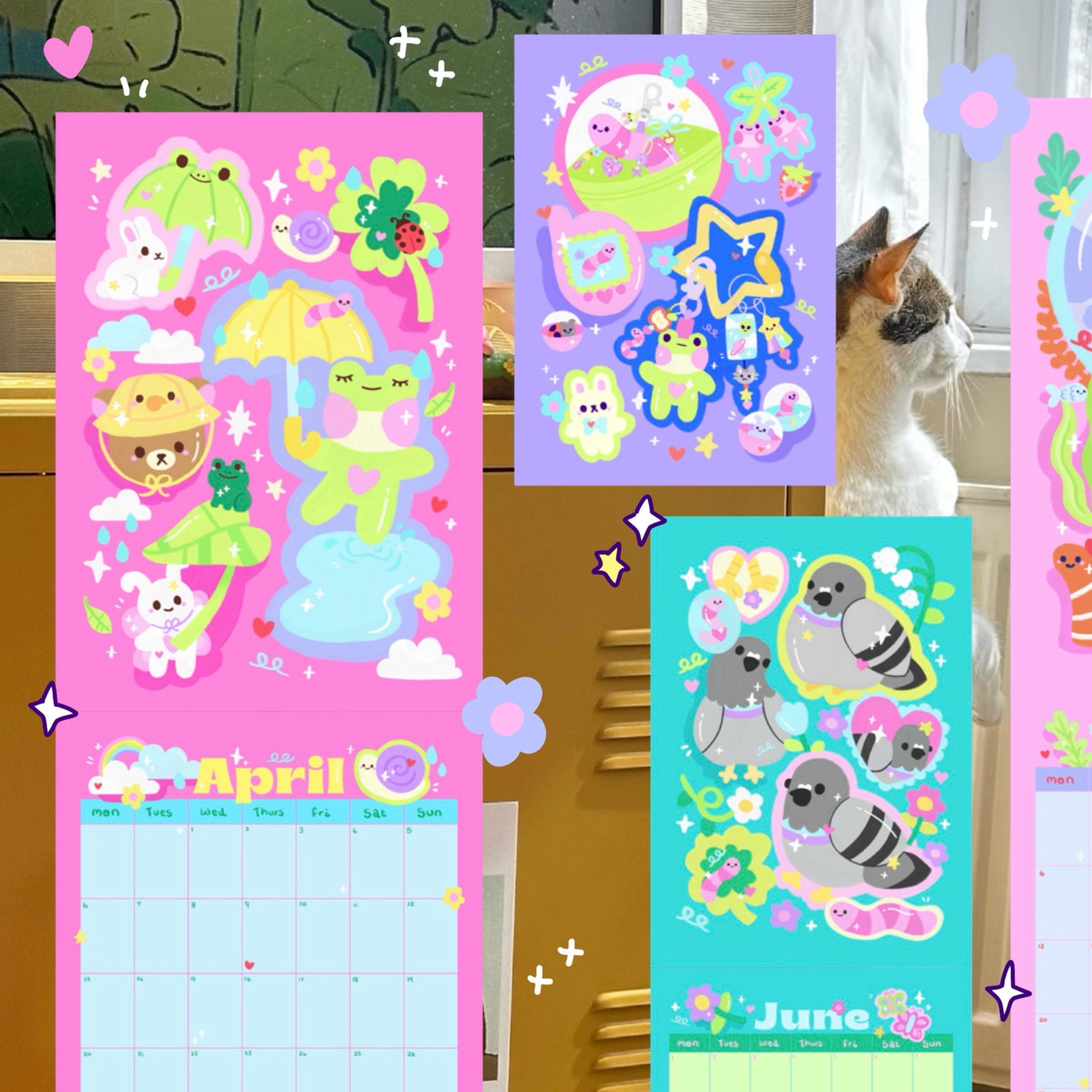 Double page calendar! 24 pages, wire bound with punch hole for hanging. Can tear prints out to keep after use. Uncoated paper so perfect for smooth writing, A4 size (each page is a4, so a spread is 2 a4 pages)