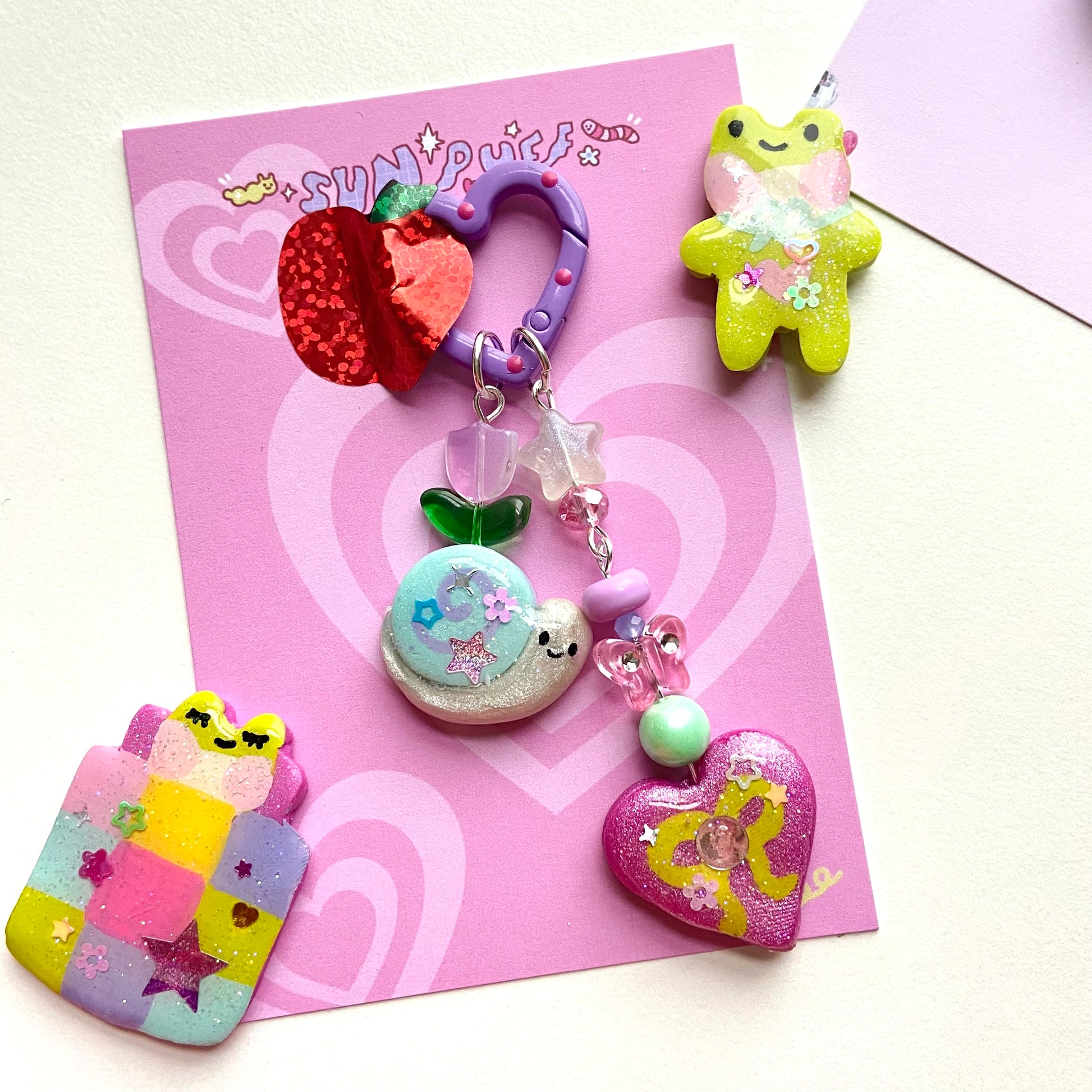 Double charm carabiner/keychain. Mixmatched design with a mix of clay, glass and acrylic beads. One sided charms.
